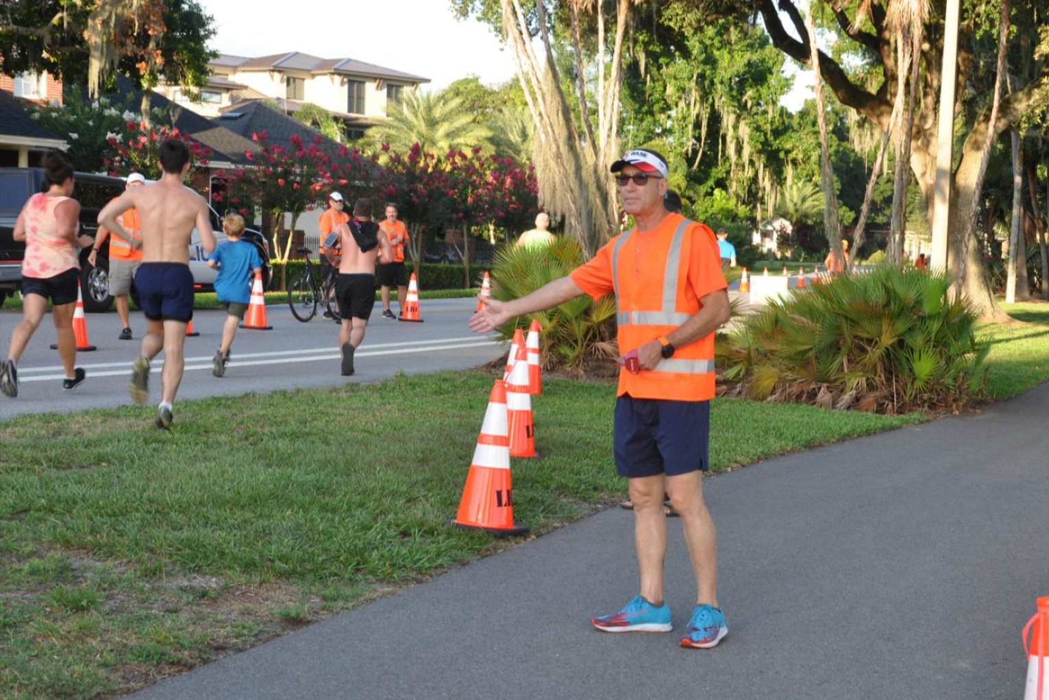 The volunteer at Brandon will help reset the lane divider cones and then help direct runners toward the finish as they transition off the path to the street.